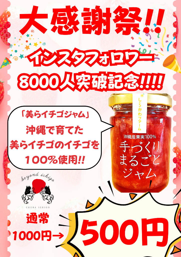 Instagramフォロワー8000人突破記念として!美らイチゴジャムを通常1000円のところ、 日頃の感謝の気持ちを込めて今回特別に🍓🍓 500円!!で販売します!!🍓🍓👏👏🉐🉐 (※数に限りがございますお早めにどうぞ!)
